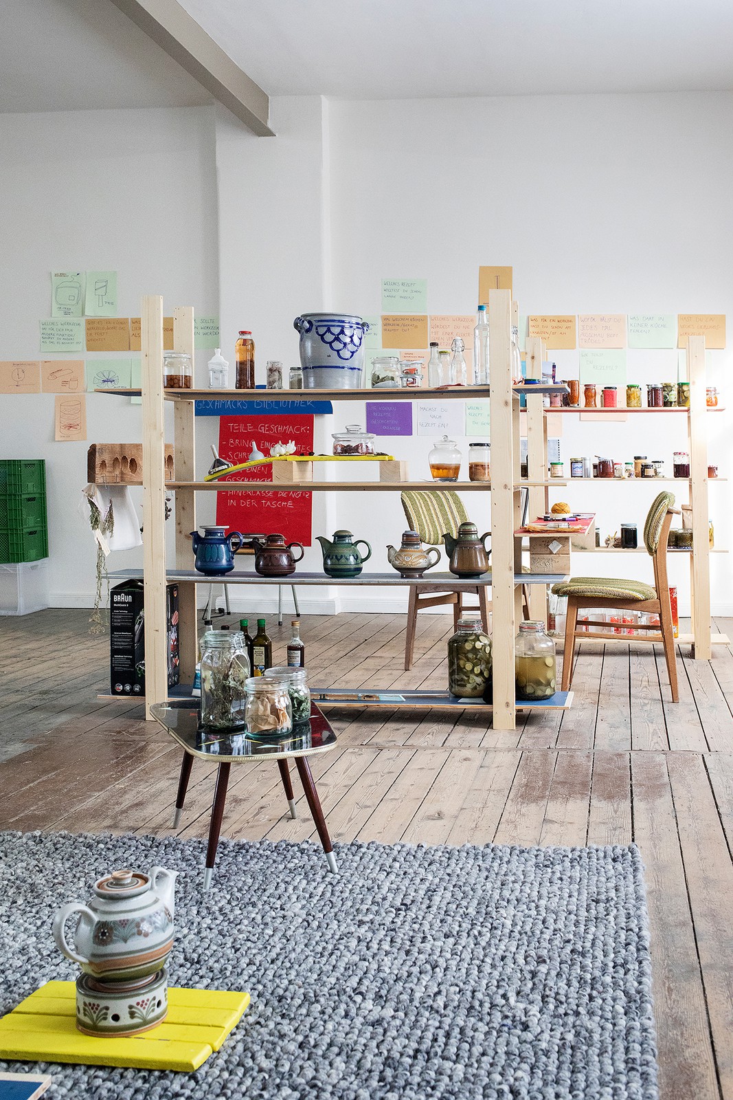 The ongoing installation is intended as a living archive for local plants, surprising flavors, and shared knowledge. The central question is: What flavors are hidden in our immediate surroundings—and how can they be preserved, passed on, and experienced together? The flavor library invites visitors to share, try out, and document recipes and preservation methods. Preserves and pickles are not only preserved, but also exchanged – as an invitation to diverse taste experiences and collective memory. The exchange character of the library emphasizes a practice of giving and sharing, in which local plants receive new attention and become visible as carriers of unusual, experimental flavors. As a space for situational encounters and the production of material and immaterial knowledge, the Taste Library exemplifies the concerns of the exhibition: rethinking ecological relationships—through artistic means, through collective action, and through sensory experience. The Taste Library is being expanded: an exchange shelf is located in the café of M.1.