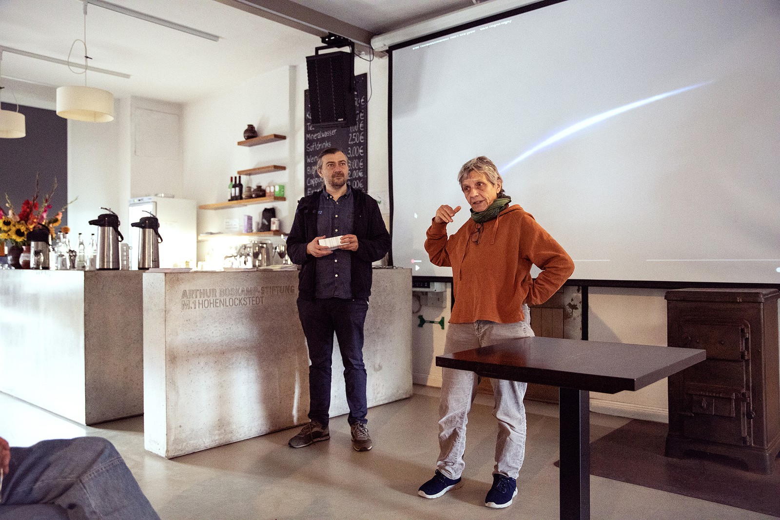 Lene Markusen continues her wall drawing, Camilla Berner's Der Unsichtbare Garten (Hohenlockstedt) continues to grow – enriched with images and plants from the summer. Seraina Grupp, together with Marle Rudolph, is expanding the flavour library with preserves made from surplus produce from the Springhoe organic farm and is moving into the M.1 café with an exchange shelf. Marta Musso & Riikka Tauriainen present the results of their Plankton Studio in film format – microscopic finds from the waters around Hohenlockstedt. The potatoes planted for the first assembly with Daniela Zambrano Almidón have been harvested, making room for Zambrano's potato drawings. Byungseo Yoo's social sculpture Canteen Fermentation Social takes on new momentum in the wall diagram.