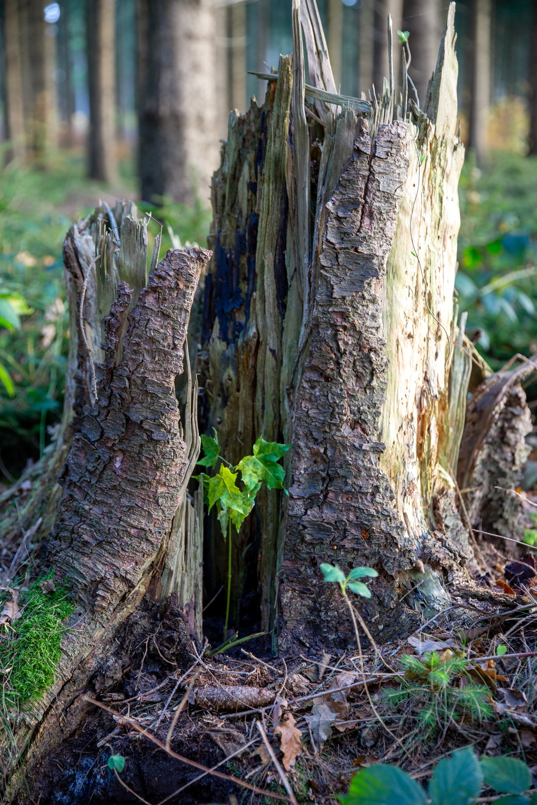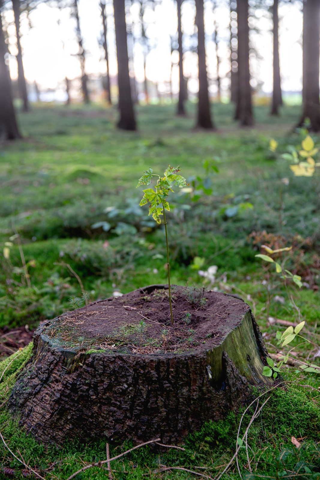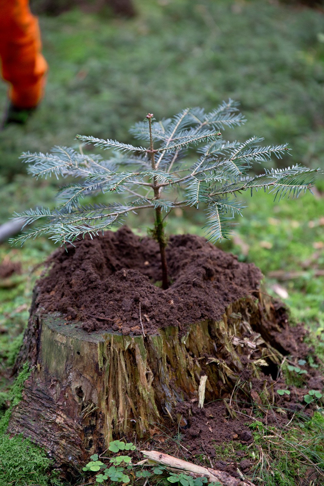 The project A Grafted Future by Camilla Berner was activated on 13 November 2025, through the planting of eight young trees at the forest of Bücken, close to Hohenlockstedt. Together with forester Björn Berling, saplings of silver fir and beech, raised in the local tree nursery, were planted directly on and into old tree trunks — an experimental method that might offer protection from deer and small rodents while potentially accelerating growth through the remaining root structures of the former old trees. Each planting site was documented photographically and marked with GPS coordinates, forming the basis for an ongoing observation of the trees' development over time.